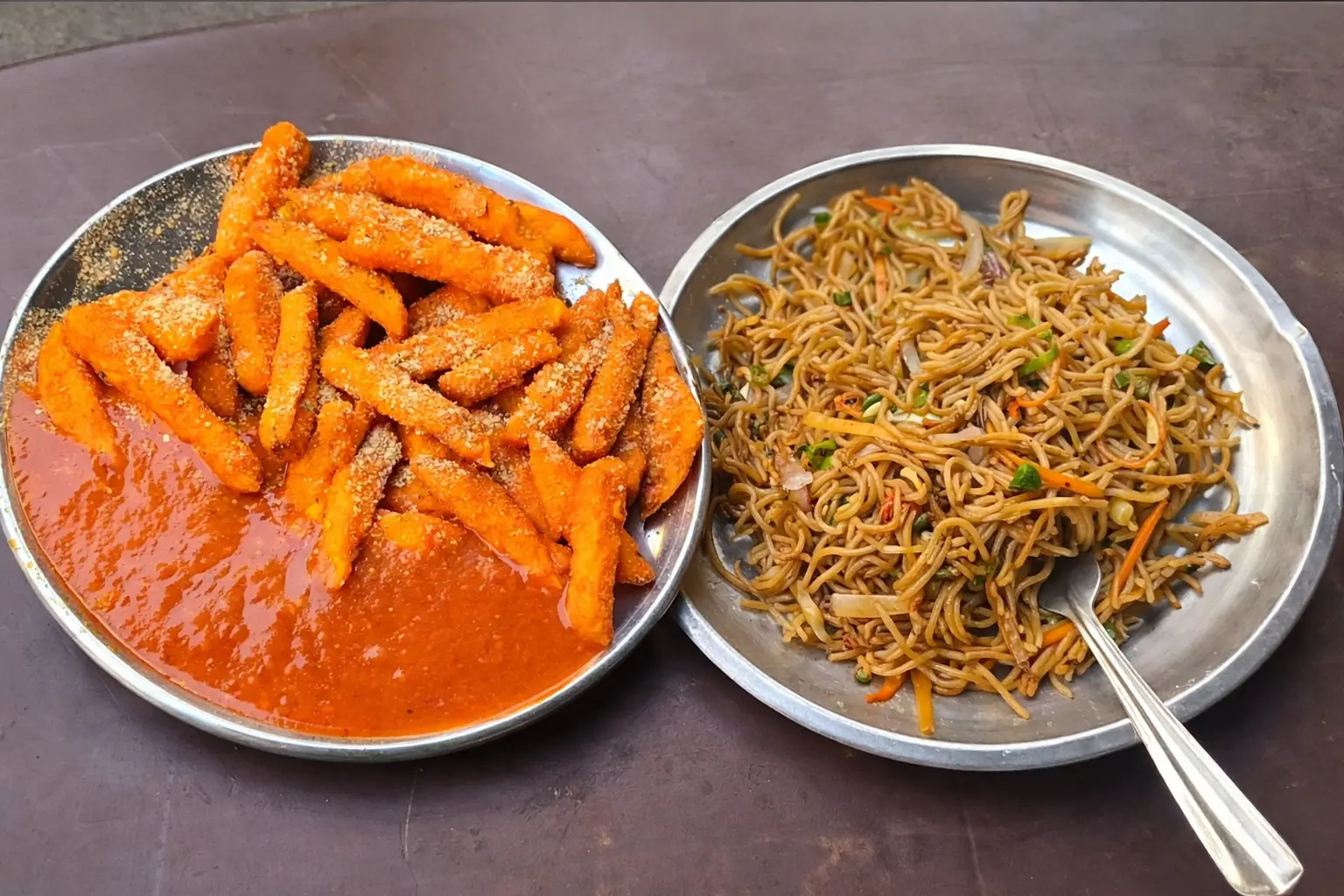 The noodles go well with the fries. They are cooked just right and mixed with fresh vegetables that add crunch and freshness. The sauce is evenly spread, giving the dish a smoky and savory flavor that feels authentic and hearty. Together, the two dishes create a satisfying and enjoyable combination. This meal is perfect for anyone who loves flavorful, desi-style comfort food with a strong taste.